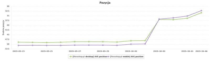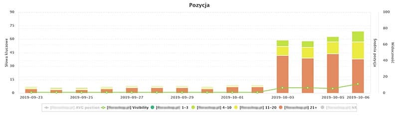 Pozycjonowanie sklepu internetowego rozpoczeliśmy 01.10.2019 – przez 6 dni naszych działań związanych z pozycjonowaniem sklepu internetowego 12 słów kluczowych osiągnęło pozycję TOP 10, kolejnych 12 słów kluczowych widocznych jest na w TOP 20, czyli drugiej stronie wyników wyszukiwania natomiast kolejnych 38 słów kluczowych widoczne jest do <50 miejsca w wynikach wyszukiwania