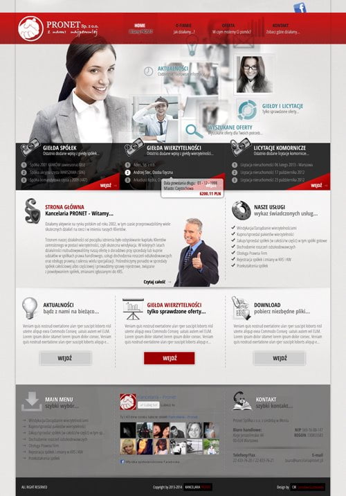 Głównym profilem działalności firmy Kancelaria Pronet z siedzibą w Warszawie jest doradztwo i kompleksowa obsługa prawna. Strona przeszła ogromną przebudowe, na której zostało uruchomione sporo modułów i dodatkowych funkcjonalności tj. giełdy oraz licytacje komornicze.